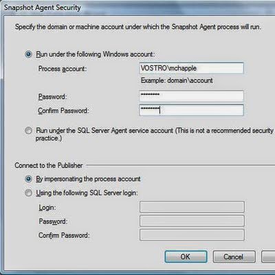- Click the ellipses ("...") button to configure Distribution Agent Security. You will be asked to provide account information that will be used to authenticate the subscription connection. When you are finished, click the Next button to continue.