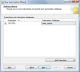 - In the next window, select the subscriber server(s) by checking the box to the left of each server you wish to receive the subscription. If the server you wish to use is not listed, click the Add Subscriber button to add it to the list. You should also select the subscription database for each subscriber using the pull-down menu to the right of each selected server. When you are finished, click the Next button to continue.